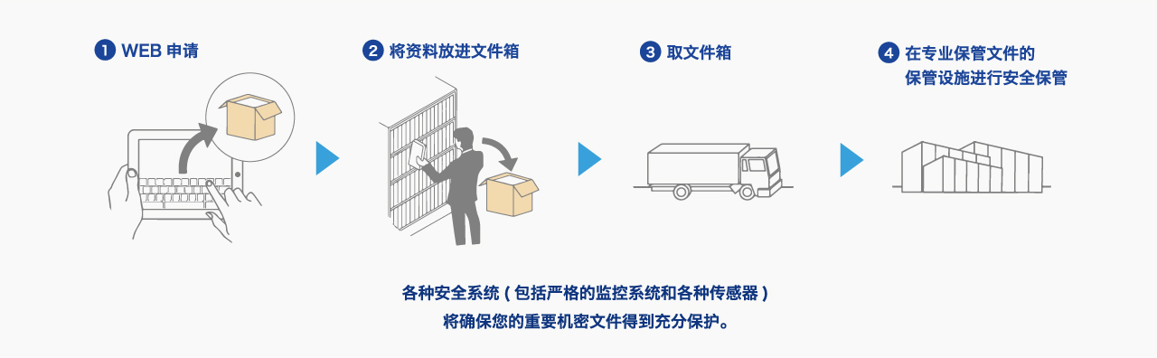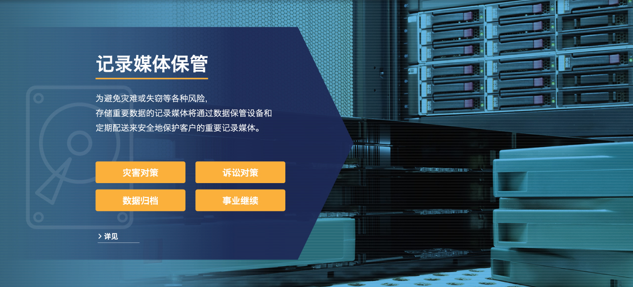 为避免灾难或失窃等各种风险,存储重要数据的记录媒体将通过数据保管设备和定期配送来安全地保护客户的重要记录媒体。