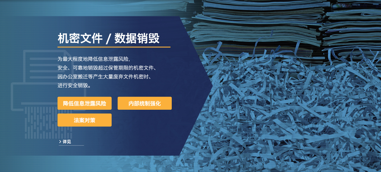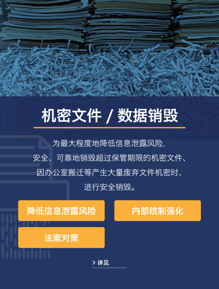 为最大程度地降低信息泄露风险,安全、可靠地销毁超过保管期限的机密文件、因办公室搬迁等产生大量废弃文件机密时、进行安全销毁。